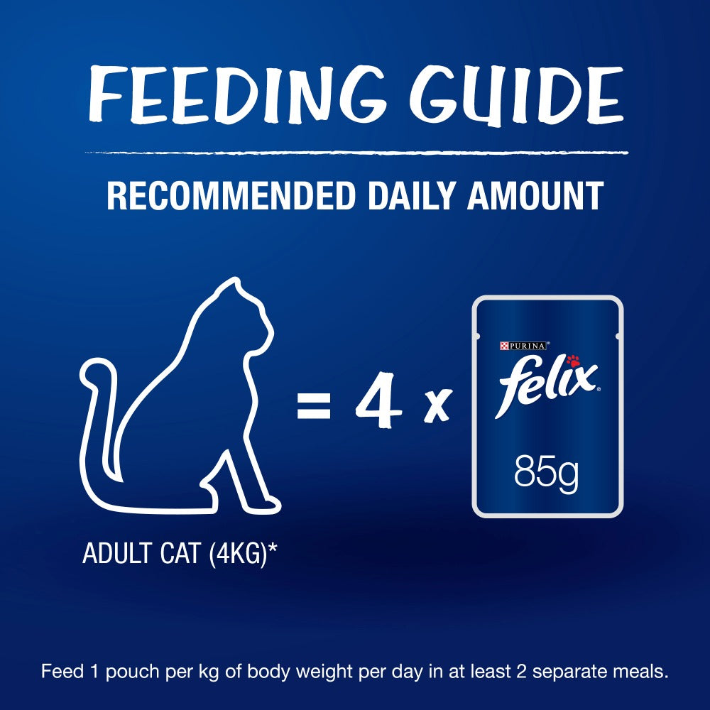Felix As Good as it Looks™ is a range of delicious meals specially prepared with tender meaty pieces in a succulent jelly which look and smell so meaty, it looks like food you have cooked yourself. They are full of healthy goodness to satisfy 100% of your cat's daily needs when fed according to the feeding guidelines on the pack.